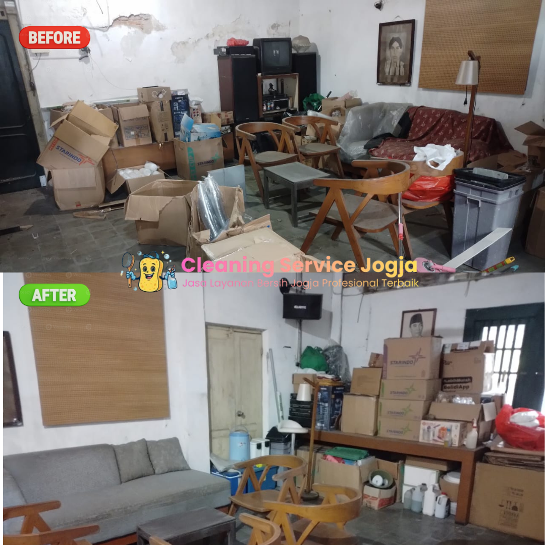 - Barang pribadi ditata rapi (bukan bongkar lemari/gudang). Pindah barang berat & angkut sampah besar bisa ada biaya tambahan.